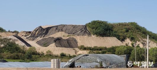 인천 서구 백석동 수도권매립지 인근에 있는 사월마을. 비닐 하우스 뒤편으로 순환골재 적치장이 보인다. 인천시 제공 |