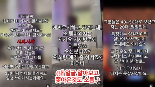 그러면서 “저는 40~50대로 보이는 그분들의 딸뻘인데 특정 가수 임원진이면 일반인 방청객까지 통제해도 되는지 모르겠다. 너무 무서워서 다시는 못 갈 것 같다”며 진저리를 쳤다.