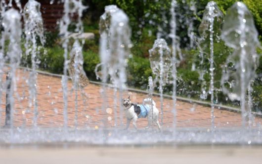 서울 낮 최고기온이 25도 이상 오르며 더운 날씨를 보인 13일 서울 동작구 보라매공원 바닥분수대에서 강아지가 솟아오르는 분수를 바라보고 있다. 2025.05.13. 뉴시스 |