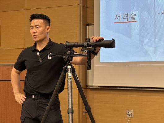 이상규 저격 전문가가 지난 16일 대전 컨벤션센터(DCC)에서 창끝전투학회 SAM2025 에서 '저격술' 강의를 하고 있다. /이상규 전문가 제공 |
