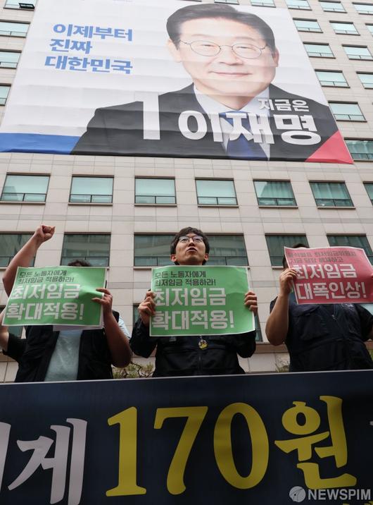 [서울=뉴스핌] 김학선 기자 = 민주노총 공공운수노조 조합원들이 20일 서울 여의도 이재명 더불어민주당 대선후보 캠프 앞에서 "대선후보에게 170원을 배달합니다" 최저임금 인상 촉구 기자회견을 열고 있다. 지난해 최저임금위원회는 2025년 최저임금을 기존 대비 170원 인상하는 10,030원으로 결정, 이는 작년대비 1.7% 인상으로 1988년 제도 시행이래 역대 두 번째로 낮은 인상률을 보였다. 2025.05.20 yooksa@newspim.com