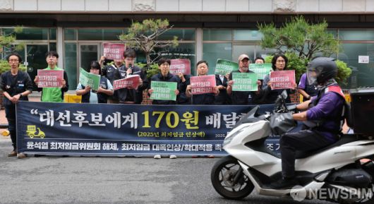[서울=뉴스핌] 김학선 기자 = 민주노총 공공운수노조 조합원들이 20일 서울 여의도 이재명·김문수 대선후보 캠프 앞에서 "대선후보에게 170원을 배달합니다" 최저임금 인상 촉구 기자회견을 열고 있다. 지난해 최저임금위원회는 2025년 최저임금을 기존 대비 170원 인상하는 10,030원으로 결정, 이는 작년대비 1.7% 인상으로 1988년 제도 시행이래 역대 두 번째로 낮은 인상률을 보였다. 2025.05.20 yooksa@newspim.com