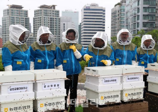 [이데일리 김태형 기자] 지준섭(가운데) 농협중앙회 부회장이 세계꿀벌의날(5월 20일)을 맞아 ‘농협과 함께하는 도심 속 꿀벌이야기’ 행사에 참석하고 있다.