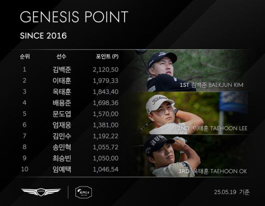 총 2,120.50포인트를 기록한 김백준은 개막전 ‘제20회 DB손해보험 프로미 오픈’ 우승으로 제네시스 포인트 1위에 등극한 이후 ‘2025 우리금융 챔피언십’, ‘제44회 GS칼텍스 매경오픈’, ‘KPGA 클래식’, “SK텔레콤 오픈’까지 5개 대회 연속 제네시스 포인트 1위를 질주하고 있다.