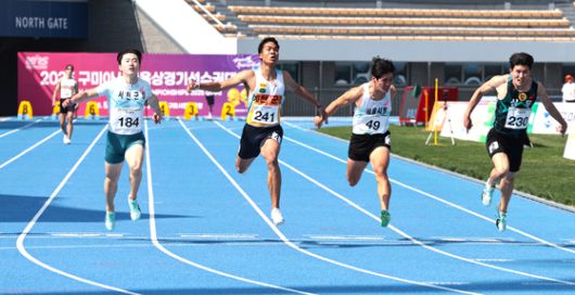지난달 열린 육상 단거리 국가대표 선발전에서 나마디 조엘진(왼쪽 두번째)이 1위로 결승선을 통과하고 있다. 사진 대한육상연맹 |