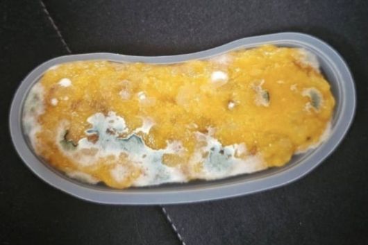 함께 첨부한 사진에는 플라스틱 용기에 든 노란색 떡 곳곳에 곰팡이로 추정되는 푸른색 이물질이 묻어 있는 모습이 담겼다.