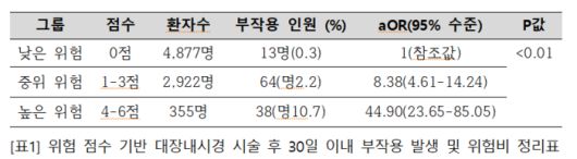 연구팀은 2017년 8월부터 2022년 8월까지 강남세브란스병원에서 대장내시경을 받은 60세 이상 환자 8154명을 대상으로 분석을 진행했다. 시술 후 30일 이내 응급실 내원 또는 계획되지 않은 입원을 부작용으로 정의하고, 이를 예측할 수 있는 지표로 혈액검사 기반 노쇠 지표(FI-LAB)와 항혈소판제·항응고제 복용 여부를 활용했다. 노쇠 지표는 측정값에 따라 낮음(〈0.25), 중간(0.25-0.40), 높음(〉0.40) 의 세 단계로 구분했다.