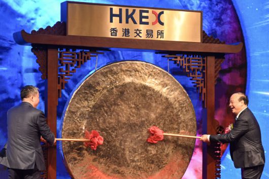 중국 배터리 대기업 CATL의 젠위췬 회장(오른쪽)이 20일 홍콩에서 열린 CATL의 홍콩 증시 상장 첫 거래를 알리는 행사에서 징을 울리고 있다.(사진=AFP) |