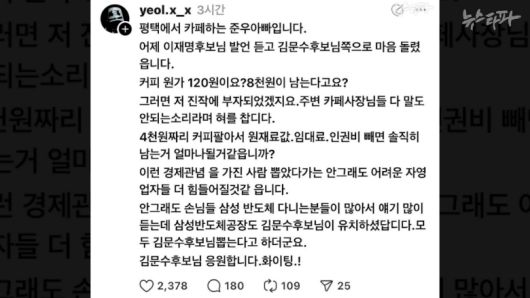 문제의 게시글은 지난 16일 이재명 후보가 전북 군산 유세 중 “커피 원가가 120원”이라고 발언한 다음 날 소셜미디어 스레드(Threads)에 처음 올라왔다. 닉네임 'yeol.x_x'는 스레드에 “평택에서 카페하는 준우아빠입니다”라고 자신을 소개하며 "어제 이재명후보님 발언 듣고 김문수후보님쪽으로 마음 돌렸읍니다"라고 적었다.