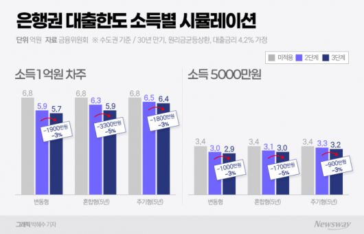 또한 연소득 5000만원인 차주가 수도권에서 주담대(혼합형)를 받을 경우 기존 한도는 3억1000만원이었지만 3단계부터는 3억원으로 감소한다. 같은조건으로 변동형 주담대 한도는 기존 3억원에서 1000만원 줄어든 2억9000만원이다.