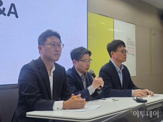 20일 SKT는 서울 중구 삼화타워에서 침해 사고 일일브리핑을 열었다. 사진은 왼쪽부터 김희섭 PR센터장, 임봉호 MNO사업부장, 류정환 네트워크인프라센터장(부사장) |