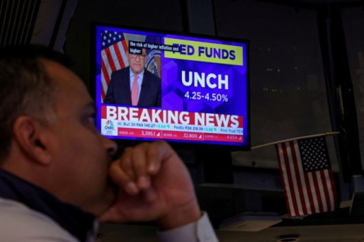 지난 7일(현지시간) 미국 뉴욕 증권거래소에서 연방공개시장위원회(FOMC)가 금리를 4.25~4.5%로 동결했다는 뉴스가 나오고 있다./로이터=뉴스1 |