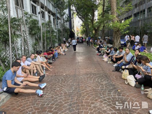 [방콕=AP/뉴시스] 3월 28일태국 방콕의 주거용 건물에서 대피한 주민들이 집으로 돌아가도 된다는 안내를 기다리며 대기하고 있다. 이날 미얀마 만달레이에서 규모 7.7의 강진이 발생해 인접국인 태국 방콕에서 건설 중이던 30층 건물이 무너져 최소 10명이 숨지고 약 100명이 매몰된 것으로 알려졌다. 2025.05.20. |