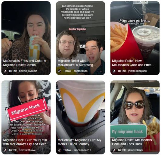동영상 플랫폼 틱톡에는 ‘큰 사이즈의 코카콜라와 감자튀김 조합이 편두통에 즉각적인 효험이 있다’라고 주장하는 콘텐츠가 많다. 조회 수 400만 건을 기록한 영상을 보면 한 여성이 맥도날드 드라이브 스루에서 구입한 콜라와 감자튀김을 먹으며 “이틀 동안 두통이 있었는데 틱톡에서 도움이 될 거라고 해서 이렇게 하고 있다”라고 말한다.