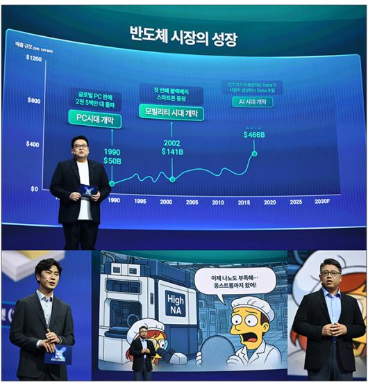 ▲ <머리카락 100만 분의 1 반도체 세션에서 강의 중인 신창환 고려대 전기전자공학부 교수(위), 이철호 서울대 전기정보공학부 교수(아래 왼쪽), 권석준 성균광대 화학공학부 교수(아래 오른쪽)>