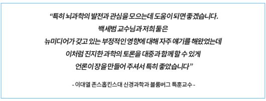 이대열 교수는 그러나 뇌내현실은 뇌과학에서 가능하냐 아니냐를 넘어 여러 가지 부작용과 윤리적인 문제를 불러일으킬 수 있기 때문에 그와 같은 기술을 사회가 어떻게 받아들여야 할지, 무엇을 고려하면서 진행해야 할 지에 대한 토론이 연구 못지않게 중요하다고 강조했습니다.