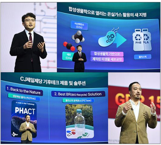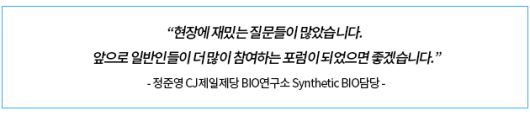 정준영 CJ제일제당 BIO연구소 Synthetic BIO 담당은 비비고와 햇반을 만드는 CJ제일제당이 지속가능한 미래를 위해서도 많은 노력을 하고 있다는 것을 아마 일반인들은 잘 모를 것이라고 전제하면서 미생물 발효 기반식품 같은 그린 바이오[2] 사업을 넘어 중장기적으로는 화이트 바이오[3] 영역으로 확장해가고 있다고 했습니다.