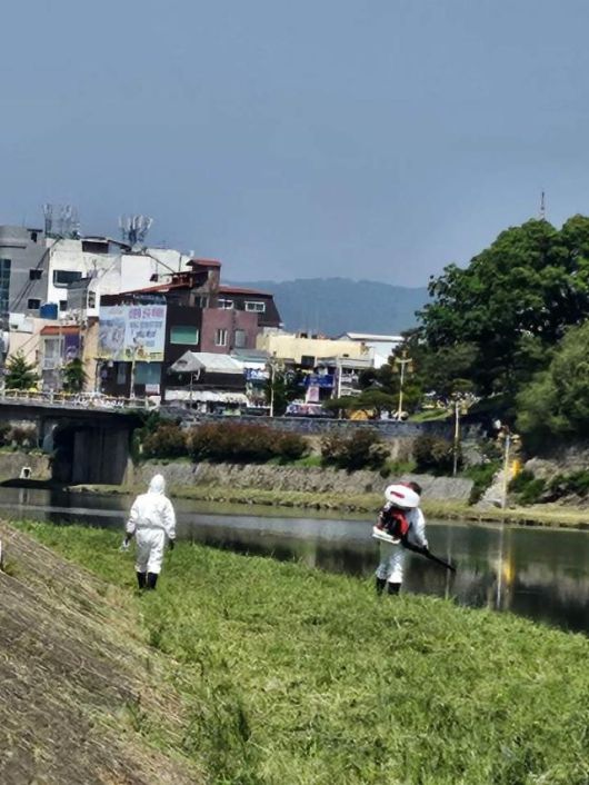 밀양아리랑대축제를 대비해 밀양강 주변 방역 소독을 하고 있다. [사진=밀양시] |