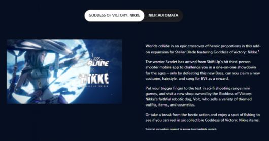 해당 소식은 북미 플레이스테이션 공식 홈페이지를 통해 밝혀졌다. PC 버전 <스텔라 블레이드>의 상세 정보와 함께 <니어: 오토마타>와 <니케> 콜라보 DLC 정보를 함께 공개한 것. 해당 내용에 따르면 ‘홍련’과의 1:1 보스전, 사격장 미니 게임, ‘볼트’의 상점, 낚시 콘텐츠 등을 선보일 예정이다.