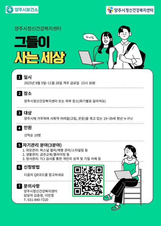지원 대상은 양주시에 거주하는 19세 이상 39세 이하 청년으로, 참여를 희망할 경우 전화(☎031-840-7320) 또는 전단지 내 QR코드를 통해 신청할 수 있다.