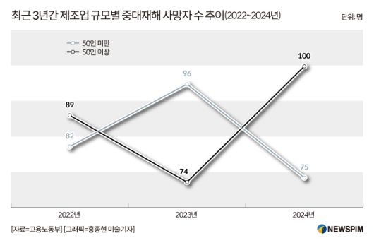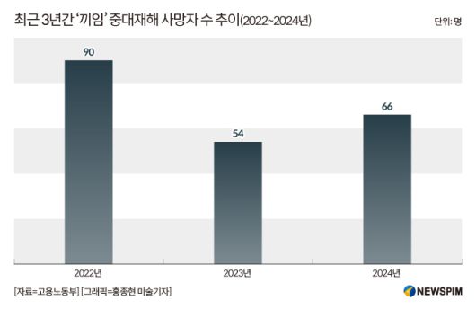 고용부에 따르면 최근 '끼임'으로 사망한 중대재해 사망자 수는 2022년 90명, 2023년 54명, 2024년 66명으로 집계됐다. 업종을 보면 제조업의 끼임사 위험이 높다. 최근 3년간 제조업 규모별 사망자 수를 보면 50인 미만 사업장은 2022년 82명에서 2024년 75명으로 줄어든 반면, 50인 이상 사업장에서는 2022년 89명에서 2024년 100명으로 늘었다.