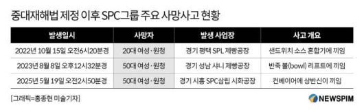 SPC그룹 내 중대재해 발생은 고질적인 문제로 지적된다. 지난 2022년 중대재해처벌법 제정 이후 SPC그룹에서 발생한 중대재해는 총 3건(3명 사망)으로, 모두 끼임사로 목숨을 잃었다.
