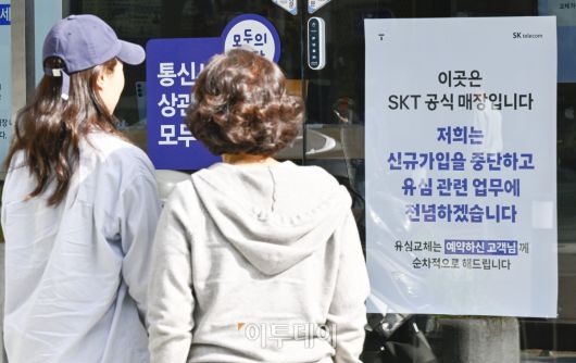 6일 서울 시내의 한 SK텔레콤 직영점에서 시민들이 신규 가입 업무 중단 안내문을 살펴보고 있다. SK텔레콤은 5일부터 유심(USIM) 정보 해킹 사고로 유심 교체를 원하는 기존 가입자부터 우선적으로 교체하기 위해 전국 T월드 매장과 온라인에서 신규 가입 업무를 중단했다. 조현호 기자 hyunho@ |