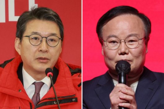 신동욱 국민의힘 중앙선거대책위원회 수석대변인(왼쪽), 김문수 후보 측 김재원 비서실장. 〈사진=연합뉴스〉 |
