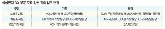 모바일 경험(MX) 사업부를 이끌어온 노 사장은 DX 전체를 총괄하는 중책까지 떠안게 된 셈이다. 무선 사업 출신 인사가 가전과 모바일, TV, 헬스케어를 아우르는 조직을 이끄는 것은 삼성전자 내부에서도 이례적인 일이다.