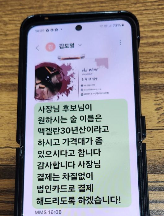 오후 4시께에는 전화로 “혹시 양주도 파느냐”고 물었고 없으면 준비해오겠다고 했다. 이후 “주류업체에서 개인 거래는 안 한다고 한다. 나중에 법인카드로 결제할 테니 이 업체에 미리 양주값을 정산해달라”고 했다. 문자메시지로 ‘후보님이 원하신다’며 고급 양주 사진과 서울에 있는 ‘올드 와인 코리아’라는 양주업체 명함을 보냈다. 한병에 800만원짜리라고 했다. 처음에는 1병을 요구했다가 4병이 필요하다고 했다. 세금을 포함해 3200만원을 결제하겠다고 약속했다.