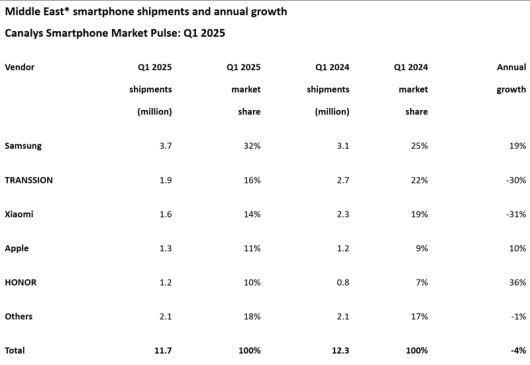 삼성전자가 개럭시 S25 시리즈와 갤럭시 A 시리즈의 선전에 힘입어 올해 1분기 중동 스마트폰 시장에서 선두 자리를 더 굳건히 다진 것으로 나타났다.
