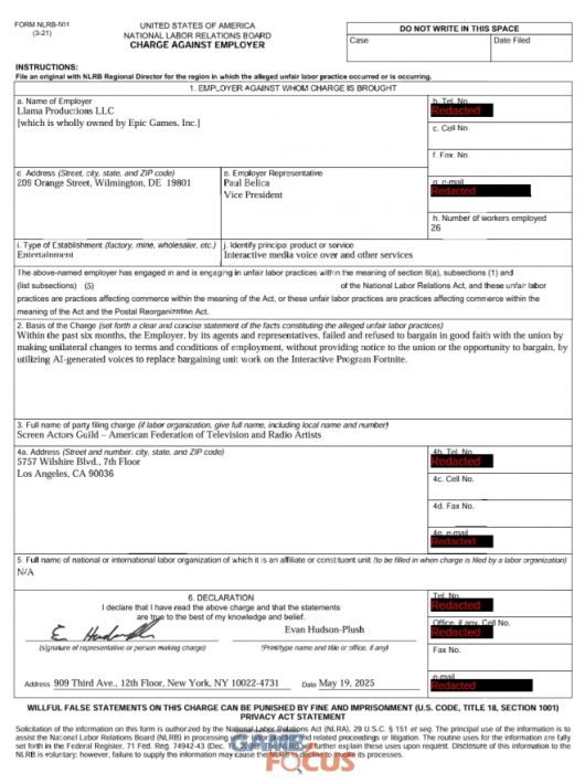 미국 배우 조합 및 텔레비전·라디오 예술가 연맹(SAG-AFTRA)는 현지시간으로 19일, 공식 성명을 내고 포트나이트를 개발 중인 에픽게임즈의 자회사 라마 프로덕션(Llama Productions)을 상대로 노동법 위반 혐의를 고발하는 불공정 노동행위 고발장을 미국 노동관계위원회(NLRB)에 제출했다. SAG-AFTRA는 약 16만 명의 이상의 배우, 아나운서, 기자, 작가, 편집자, 진행자, 배우, 가수, 성우 및 기타 엔터테인먼트, 미디어 전문가가 함께하는 미국의 대표적인 노동조합.