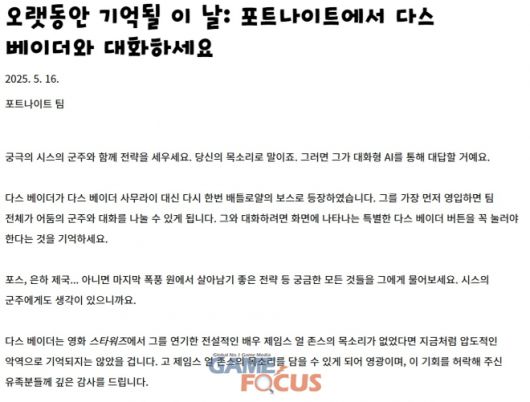 문제의 발단은 지난 16일, 에픽게임즈가 포트나이트 게임 내에 업데이트 된 스타워즈 배틀로얄 콘텐츠 업데이트와 관련해 실제 다스 베이더 역할을 연기한 고 제임스 얼 존스의 목소리를 생성형 AI로 활용하는 것을 공개적으로 밝히면서 시작됐다.