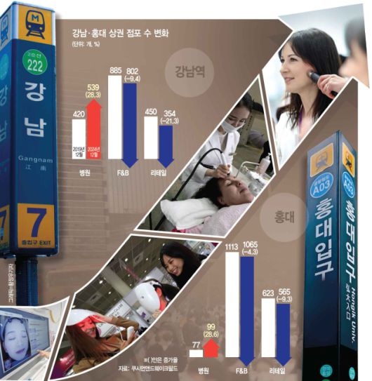 20일 글로벌 부동산 서비스 업체인 쿠시먼앤드웨이크필드에 따르면 2019년 12월 말 기준 강남역 상권(신분당선 신논현역~강남역 주변) 내 병원은 420곳이었으나 지난해 12월 말 기준 539곳으로 28.3% 증가했다. 같은 기간 홍대 상권(홍대입구역~KT&G 상상마당 주변)에서도 병원은 77곳에서 99곳으로 28.6% 늘었다.