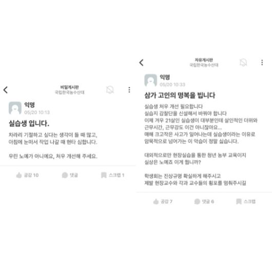 한농대 총학생회는 성명을 통해 관련학과 실습의 중단과 전수 조사, 장기 현장 실습 제도 전면 개선 등 책임 있는 대응을 촉구했습니다. 대학생 커뮤니티인 '에브리타임'과 학교 홈페이지 등에는 '우린 노예가 아니다. 처우 개선을 해달라' 등 장기 현장 실습 제도를 비판하는 글이 잇따르고 있습니다.