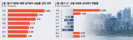 강남4구 독주는 상승률에서도 나타난다. 올 1~3월 상승률 순위를 보면 1위는 서울 강남구로 4.48% 올랐다. 2위는 서초구(3.64%), 3위는 송파구(3.41%) 등의 순으로 나타났다. 강남3구가 1위부터 3위까지 휩쓴 것이다.