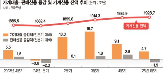올해 1·4분기 국내 가계빚이 모두 1930조원에 육박하며 역대 최고치를 경신했다. 신용카드 사용액 감소에도 주택담보대출이 10조원 가까이 늘어난 결과다. 2·4분기에도 토지거래허가구역 완화의 영향으로 주담대 증가세가 기정사실화된 가운데 오는 7월부터 3단계 스트레스 총부채원리금상환비율(DSR) 등 거시건전성 규제 정책이 시행되는 만큼 하반기에는 가계부채가 안정될 전망이다.20일 한은이 발표한 '2025년 1·4분기 가계신용(잠정)'에 따르면 3월 말 기준 가계신용 잔액은 3개월 새 2조8000억원 증가한 1928조7000억원으로 집계됐다. 지난해 2·4분기(13조4000억원)과 3·4분기(18조5000억원), 4·4분기(11조6000억원)에 이은 4개 분기 연속 증가로, 2002년 4·4분기 관련 통계가 나온 이래 최대치다.