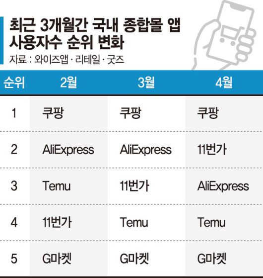 20일 와이즈앱·리테일이 한국인 스마트폰 사용자(Android+iOS)를 표본 조사한 결과에 따르면 지난 4월 한국인이 가장 많이 사용한 종합몰 앱은 쿠팡으로 월간 사용자수 3339만명을 기록하며 압도적인 1위를 이어가고 있다. 2위는 11번가가 올랐는데 월간 사용자수는 893만명으로 880만명의 알리와 847만명을 기록한 테무를 제쳤다. 올해 1월만 해도 쿠팡, 알리, 테무 순이었던 이용자수가 3개월새 쿠팡, 11번가, 알리 순으로 재편된 것이다.