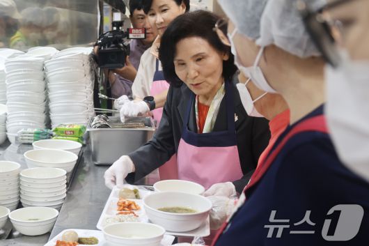 김문수 국민의힘 대통령 후보의 부인 설난영 여사가 20일 서울시립 은평노인종합복지관을 찾아 배식봉사 활동을 하고 있다. (국민의힘 제공. 재판매 및 DB금지) 2025.5.20/뉴스1 |