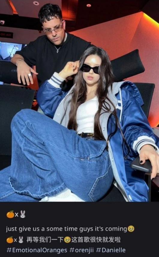 19일 R&B 혼성 듀오 이모셔널 오렌지스(Emotional Oranges)는 공식 계정에 뉴진스 다니엘과 찍은 사진을 공개했다. 사진 속 다니엘은 데님 청바지에 후드 점퍼를 입고 선글라스를 착용한 모습이다.