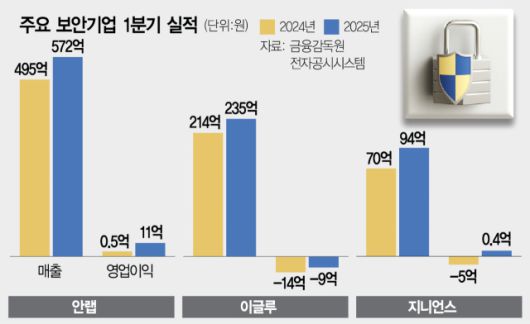 20일 서울경제신문이 안랩(053800)·이스트소프트(047560)·지니언스(263860)·파수(150900)·라온시큐어(042510)·지란지교시큐리티(208350)·이글루(067920) 등 국내 주요 보안 기업 7곳의 올해 1분기 분기 보고서를 분석한 결과 이들의 총매출액은 1420억 원으로 집계됐다. 이는 전년 동기 대비 9.5% 증가한 수치다. 안랩(15.4%), 지니언스(34.3%), 파수(3.7%), 이글루(9.8%), 지란지교시큐리티(10.4%) 등 대부분 기업의 매출이 늘었다. 다만 이스트소프트(-1.9%), 라온시큐어(-3.5%) 등은 감소했다.
