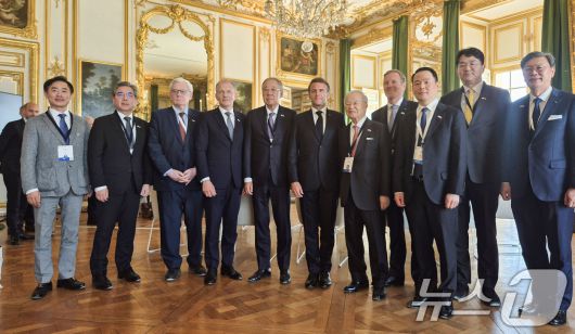 류진 한경협 회장을 비롯한 한국 민간 경제사절단이 19일 프랑스 베르사유궁에서 열린 '한-프랑스 특별 라운드테이블'에서 에마뉘엘 마크롱 프랑스 대통령가과 기념촬영을 하고 있다. 이번 회의는 마크롱 대통령이 주관하는 2025년 'Choose France Summit'행사 중 특정 국가와의 양자 비즈니스 간담회로는 유일하게 마련된 자리다. 왼쪽부터 오정강 엔켐 대표, 장재훈 현대차 부회장, 쟝 르미에르 BNP파리바 회장, 프랑수와 자코브 에어리퀴드 CEO(프측 위원장), 류진 한경협 회장, 에마뉘엘 마크롱 프랑스 대통령, 손경식 CJ회장, 바우터 반 베르쉬 에어버스 수석부사장, 허진수 SPC 사장, 조원태 대한항공 회장, 김창범 한경협 부회장 (한국경제인협회 제공. 재판매 및 DB 금지) 2025.5.19/뉴스1 |