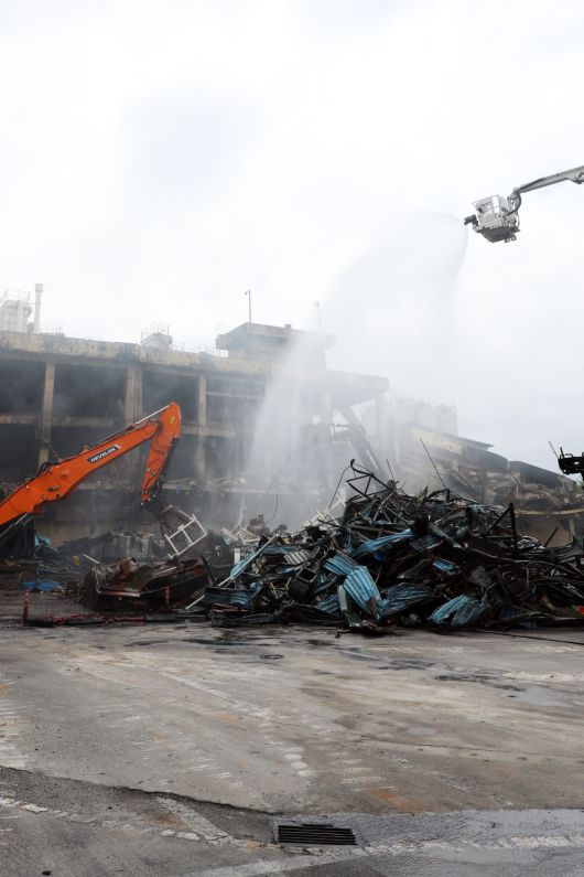 소방당국이 20일 발생 76시간 만에 광주 광산구 금호타이어 공장 화재를 완전 진화한 가운데 불에 탄 건물을 철거하기 위한 준비작업이 진행되고 있다. 연합뉴스 |