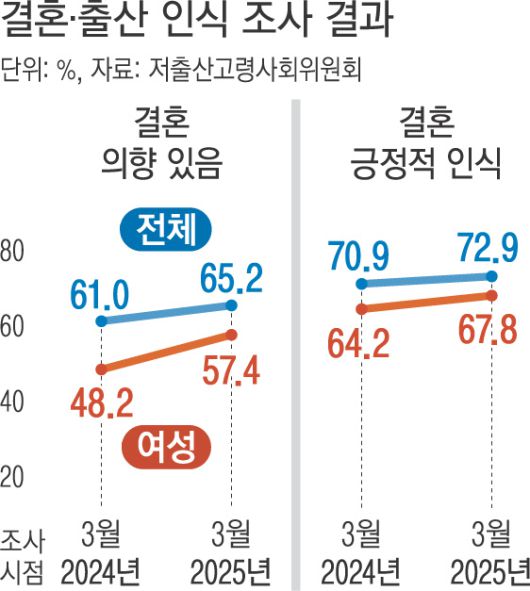 저출산고령사회위원회(저고위)가 20일 공개한 설문 결과를 보면, 결혼할 생각이 있는 20대 이상 여성 비율이 지난해 3월 48.2%에서 57.4%로 늘었다. 남녀 전체 결혼 의향은 지난해 3월 61.0%에서 65.2%로 증가했다. 저고위는 올해 3월31일~4월10일 전국 만 25~49세 국민 2650명을 대상으로 결혼·출산·양육 및 정부 저출생 대책 관련 인식 조사를 했다.