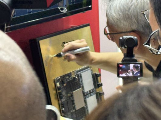 젠슨 황 엔비디아 CEO가 20일 대만 타이베이 난강 전시관에서 개최된 ‘컴퓨텍스 2025’에서 SK하이닉스 부스를 찾아 전시된 HBM에 사인하고 있다. 연합뉴스 |