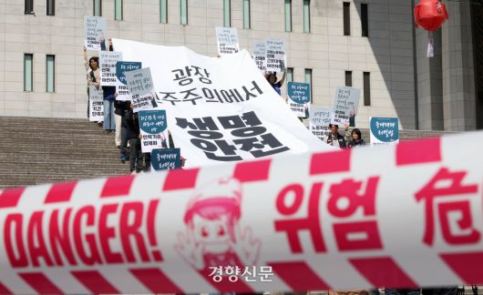 산업재해보상보험법 개정에 따른 첫 번째 기념일을 맞은 산업재해 노동자의 날인 4월 28일 서울 종로구 세종문화회관 앞에서 민주노총 회원들이 기자회견을 하고 있다. 국제노동조합총연맹은 지난 1993년 5월 10일에 태국의 완구 공장에서 발생한 화재로 노동자 188명이 사망했던 케이더 공장 화재 참사를 추모하며 1996년 4월 28일에 국제적인 추모일로 지정할 것을 제안했다. 김창길 기자 |