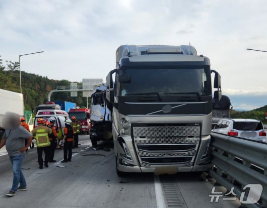 경찰에 따르면 이날 고속도로상에서 주행하던 차량이 서행하면서 24톤 윙바디 화물차를 21톤 카고트럭이 추돌하고, 곧이어 A 씨가 몰던 11톤 트럭이 카고 트럭을 후면 들이받았다.