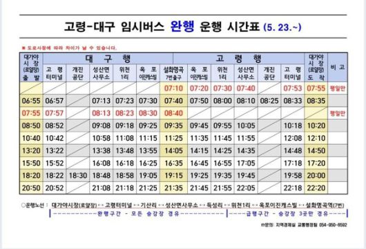 고령군↔대구 운행 버스노선도 및 시간표.사진=고령군(포인트경제) |