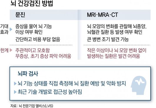 이처럼 정기검진을 통해 많은 질병을 예방할 수 있게 됐지만 유독 뇌 질환의 예방은 어려웠다. 뇌의 건강 상태를 확인할 수 있는 방법이 제한적이었기 때문이다. 예컨대 대장은 내시경으로 직접 상태를 확인하고, 대장암으로 발전할 가능성이 있는 용종을 떼어낼 수 있다. 그러나 뇌의 경우 기능 이상을 확인하기 위한 검사가 대개 증상 문진에 그친다. 문진만으로 뇌에 문제가 있는지를 알아내는 일은, 문진만으로 대장에 용종이 있는지를 알아내는 것보다 훨씬 어려운 일이다.