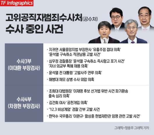 [더팩트ㅣ정채영 기자] 윤석열 전 대통령, 한덕수 전 대통령 권한대행이 신규검사 재가를 뚜렷한 이유없이 미룬 탓에 인력난에 허덕이던 고위공직자범죄수사처(공수처)가 8개월 만에 검사를 충원하면서 본격적인 수사력 보강에 나섰다. 최근 정치권과 법조계를 둘러싼 주요 사건들이 공수처에 고발되면서 수사 진행 속도에 관심이 쏠리고 있다.